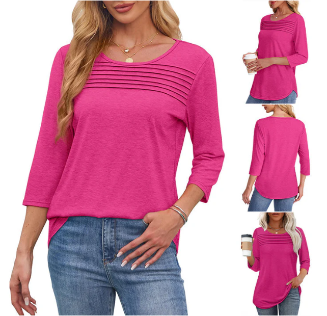 NEW🔥 2025 Women's 3/4 Length Sleeve Top Pleated Front T-Shirt